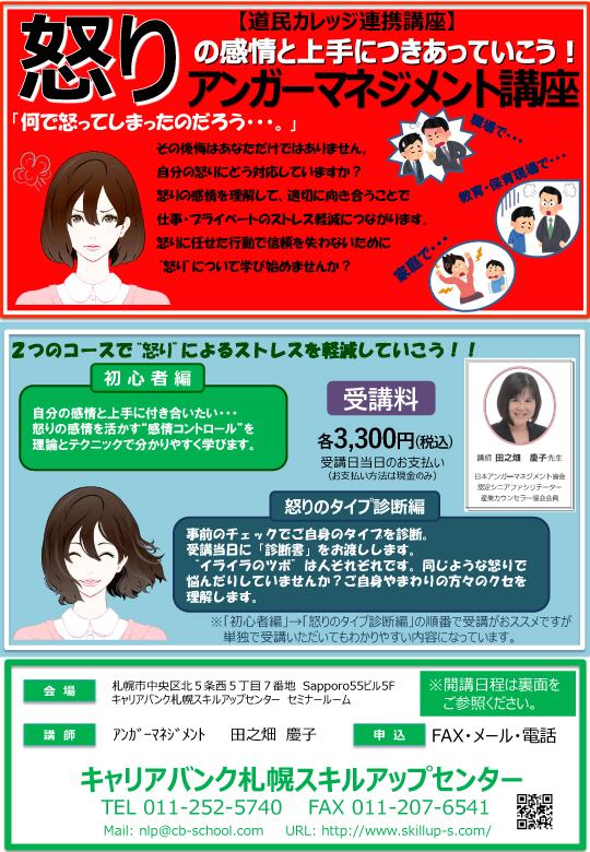 キャリアバンク札幌スキルアップセンターではNLP講座・CMCAキャリアコンサルタント養成講習以外にも様々な講座を展開しております。以下の講座への不明点などございましたらお気軽にお問い合わせ下さい。